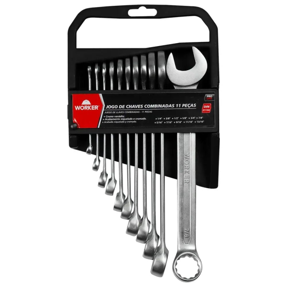 Fabricado em aço carbono especial com acabamento cromado, o Jogo de Chaves Combinada 1/4\" a 13/16\" 11 Peças Worker é a escolha ideal para projetos de manutenção e reparo. As especificações incluem embalagem em suporte plástico e medidas que englobam 1/4; 5/16; 3/8; 7/16; 1/2; 9/16; 5/8; 11/16; 3/4; 13/16; 7/8 Pol. A qualidade e durabilidade dessas chaves garantem um ótimo desempenho em diversas aplicações. Adquira já o seu e tenha em mãos as ferramentas certas para o trabalho!:}