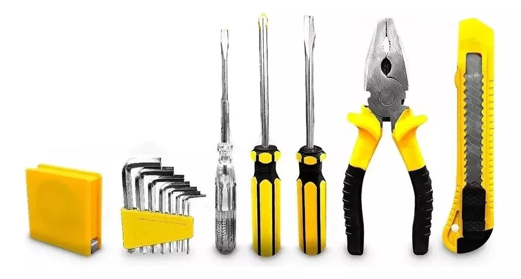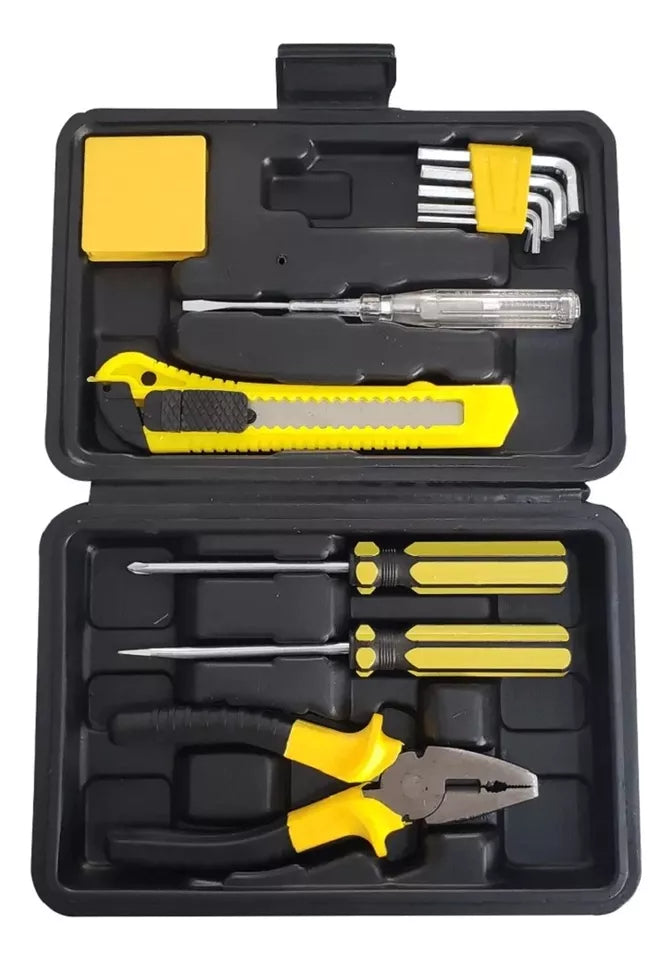 - Suas ferramentas são fabricadas em aço carbono de alta qualidade, o alicate possui cabo emborrachado, uma trena de 1 metro com um design inovador de fácil manuseio. Este kit de ferramentas é perfeito para ter em casa, além de ser uma maleta de ferramentas completa, acompanha ferramentas que irão te ajudar no seu dia a dia como chave phillips, fenda e allen para apertar e soltar parafusos, um estilete que proporciona precisão no corte, uma trena de um metro e um alicate universal que pode ser utilizado de diversas formas.