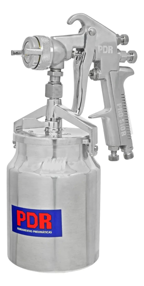 A Pistola de Pintura PRO510R da PDR PRO é uma ferramenta pneumática de alta produção, ideal para a aplicação de materiais de revestimento e acabamentos. Seu sistema de sucção utiliza a caneca de 1.000 ml (1 litro) posicionada na parte inferior para puxar o material, sendo uma excelente opção para pinturas de grandes superfícies.